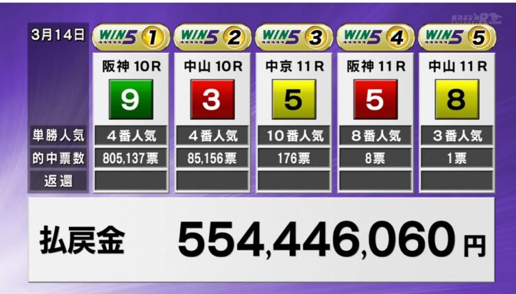 3월 14일(일) 일본중앙경마회(JRA) 5개 경주의 우승마를 적중시키는 5중승단승식 WIN5 승식에서 역대 최고 환급금 5억5444만6060엔(약 57억8천만원)이 터졌다.