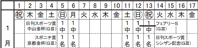 2024년 JRA 마지막 경마는 12월 28일 토요일이다. 25년 첫 경마는 1월 5일(일요일) 6일(월), 둘째주는 토일월 3일간 시행한다. 13일은 성인의 날 국민의 축일이다.