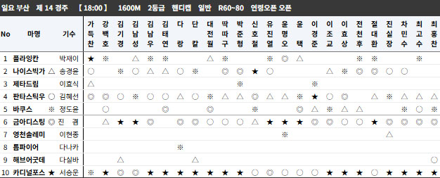 2025년 8월 10일 일요일 한국마사회 부산 경마장에서 14개 경주를 시행한다. 1경주는 10시 35분에 출발한다. 투자경마 손자병법 검빛 경마왕, 경마문화, 명승부, 코리아레이스 전문가 종합지, 스피드 예상지 5두 마번 모아보기