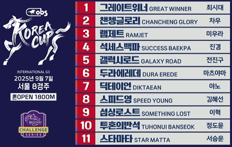 한국에서는 석세스백파, 빈체로카발로 등이 출전해 2년 연속 일본에 내준 우승 탈환에 도전한다.