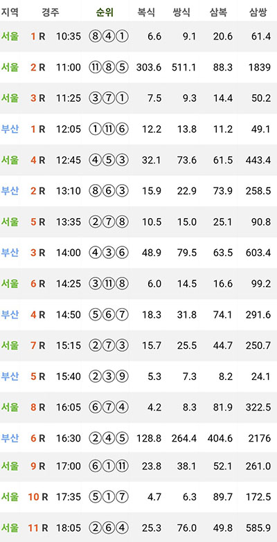 15개 경주 복승식에서 강운수(4,2,5) 및 조합 패턴이 출현했다. 한방 역전 파이널 레이스의 법칙! 부산 막경주 강운마 원투쓰리 일욜 최고배당 2176.4배 대박! 서울 후반 연속 강운수 조합, 11R 강운 복병마 우승 계산 마권 패턴 고배당으로 마무리되었다.