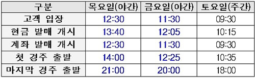 아래와 같이 입장 및 마권 발매 시간이 변경되며, 10월 2일(목)은 현장과 더비온에서 10.3.(금)~4.(토) 마권 예매가 불가하다.