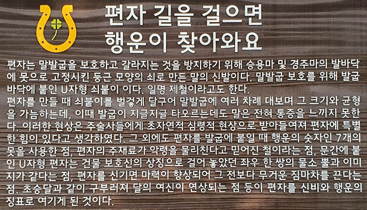 이러한 편자의 의미를 살려 완성된 <행운의 편자 길>의 의미를 담은 설명용 동판을 시작으로 부산경남 대표마 10두의 편자 동판이 출생 순서대로 설치되어 있다.