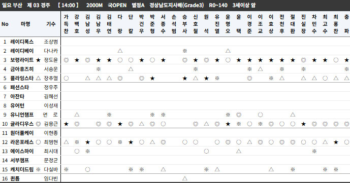 12개 경주 복승식에서 강운수(2,3,1) 및 조합 패턴이 출현했다. 부경 2개의 대상경주는 강운마 2두 입상, 한방 역전 서울 막경주는 강운마 강운수 조합으로 마무리 되었다.
