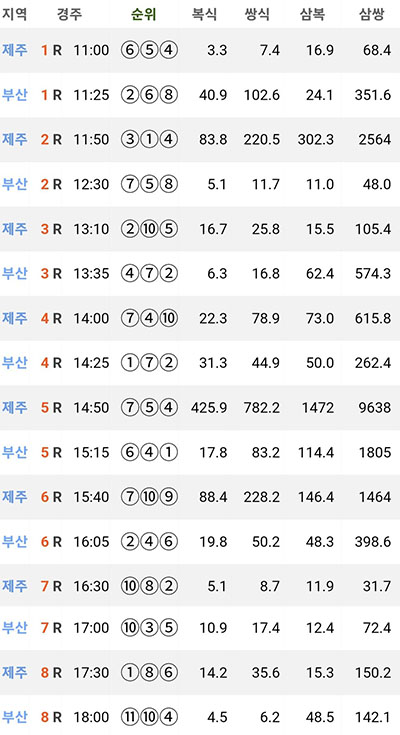 2025년 10월 31일 금요일 한국마사회 부산 경마장에서 8개, 제주 경마장에서 8개 경주를 시행한다. 제주 1경주는 11시, 부경 1경주는 11시 25분에 출발한다. 경마이기는법 검빛 경마왕, 명승부, 경마문화, 코리아레이스 전문가 종합지, 스피드 예상지 5두 마번, 마사회 출마 자료 모아보기