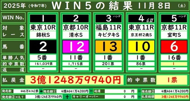 인기 11위, 16위 복병마가 2회 우승하며 단 1장 당첨되었다. 연말까지 한정으로 발매하는 토요경마 윈파이브는 매출이 낮다. 오늘 4억5천만엔 정도인데 일요일은 보통 7억엔대에 달한다.