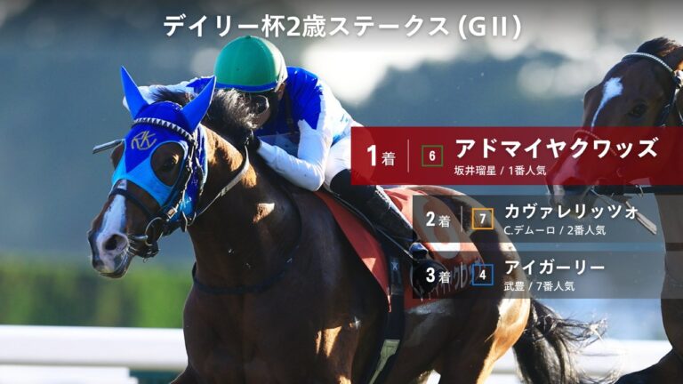 2025년 11월 15일 토요일 일본 JRA 교토경마장 제60회 데일리배 2세 스테익스(Daily Hai Nisai Stakes, デイリー杯2歳ステークス, デイリー杯2歳S, 터프 1600m) G2 대상경주 결과 사카이 류세이 기수의 인기 1위(2.6배) 어드마이어 쿼드(アドマイヤクワッズ) 데뷔 2연승 중상 첫 제패! 경주기록 1분33초1은 2013년 호라이 아키코의 기록을 0초1 단축한 대회 레코드 Admire Quads (Real Steel – Date Line, by Zoffany) 부마: 리얼스틸 생산자: … 일본 교토경마장 데일리배 2세 스테익스(G2) 사카이 기수의 어드마이어 쿼드 연승 계속 읽기