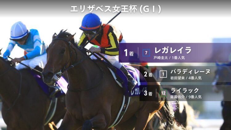 일본 교토경마장 엘리자베스여왕배(G1) 토사키 기수의 레갈레이라 우승