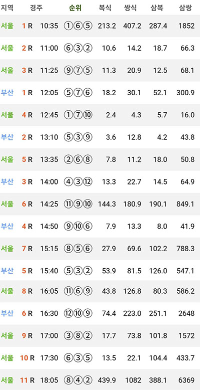복승식 43.8배, 삼쌍승식(11-6-9) 586.2배, 동일오행을 피해 후착 강운수 3조합이 나오는 11-9-6순 베팅 실패