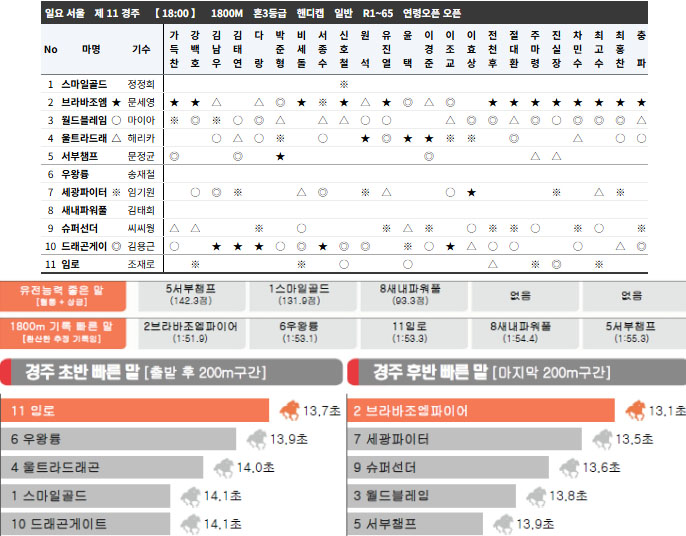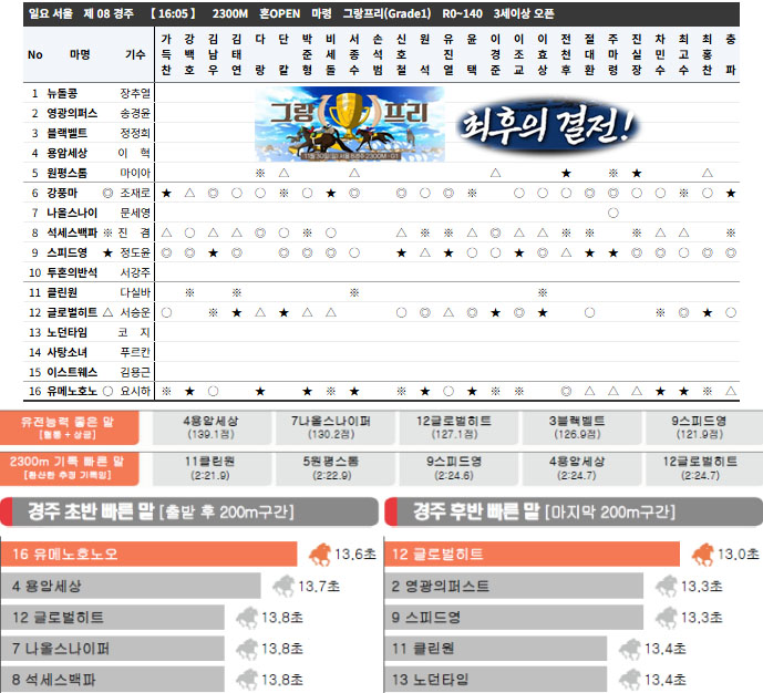 서울8R 총상금 10억원, 우승상금 5억5천만원의 연도대표마 및 최우수 국산마 선발 코리아 프리미어 시리즈 파이널 제43회 그랑프리(Grand Prix, G1, 2300) 한일 대결! 일본 고치 에이스 유메노호노오(夢の炎, 몽염)가 최외곽에서 YTN배 3착 설욕에 나선다.