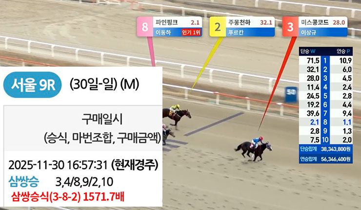 11/30 서울 9경주 삼쌍승식(3-8-2) 1571.7배! 경마의신 강운마권 토요경마에 이어 이틀 연속 천배당 적중 pic.twitter.com/CjxLq83h3y