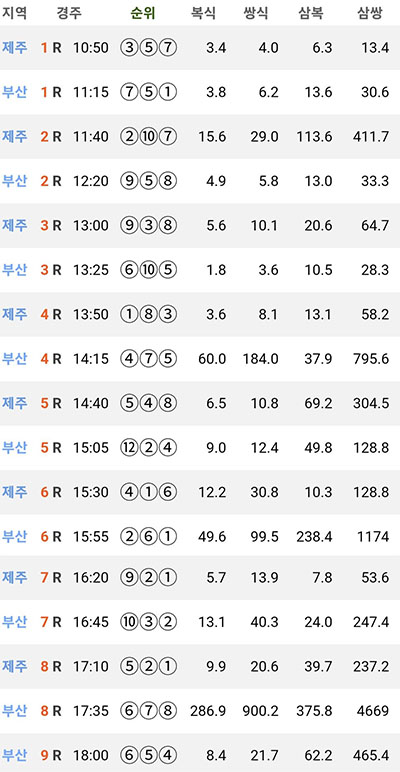 12·12 군사반란 46주년 2025년 12월 12일 금요일 한국마사회 부산 경마장에서 9개, 제주 경마장에서 8개 경주를 시행한다. 제주 1경주는 10시 50분, 부경 1경주는 11시 15분에 출발한다. 경마이기는법 검빛 경마왕, 명승부, 경마문화, 코리아레이스 전문가 종합지, 스피드 예상지 5두 마번, 마사회 출마 자료 모아보기