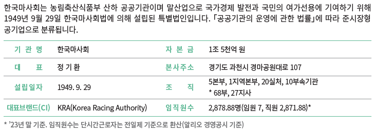 말산업으로 국가경제 발전과 국민의 여가선용에 기여하는 한국마사회(韓國馬事會, Korea Racing Authority, KRA)