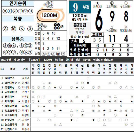 부산 마지막 네경주 연속 강운수 2 조합 및 강운마 10번 입상 대박! 6,7경주 계산마권 패턴, 특히 최고배당 삼쌍승식 8천배가 터진 7경주는 인기 9위 강운 복병마 12번 불의통치를 축으로 삼쌍 폭탄배당을 공략했지만 마권 조합에 실패하여 놓치고 말았다. 부경 막경주는 5번 대가리에 후착 강운마 원투 적중! 서울 막경주는 5번을 간과한 것이 패인이다. 8R에 이어 연속 1착 가능? 5번을 잡았으면 2천배 적중 가능한 경주였다. 관심마 7번 2 조합에 1의 수 3착