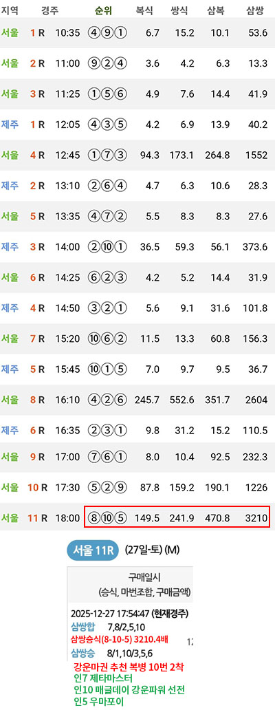 12/27 토요경마결과 패턴 분석! 한방 역전 서울 막경주 삼쌍승식 3천배 적중