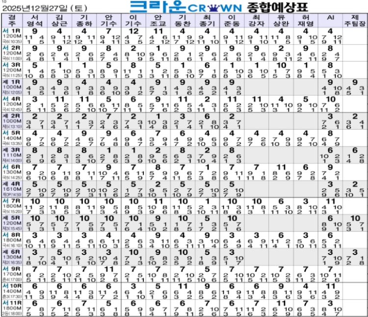 2025년 12월 27일 토요일 한국마사회 서울경마장에서 11개, 제주경마장에서 6개 경주를 시행한다. 서울 1경주는 10시 35분, 제주 1경주는 12시 5분에 출발한다. 경마이기는법 검빛 경마왕, 경마문화, 코리아레이스, 스포츠조선 전문가 종합지, 스피드, 적중 확률 업 퍼펙트 파워경마, 명승부 조교 마사회 출마 자료 모아보기