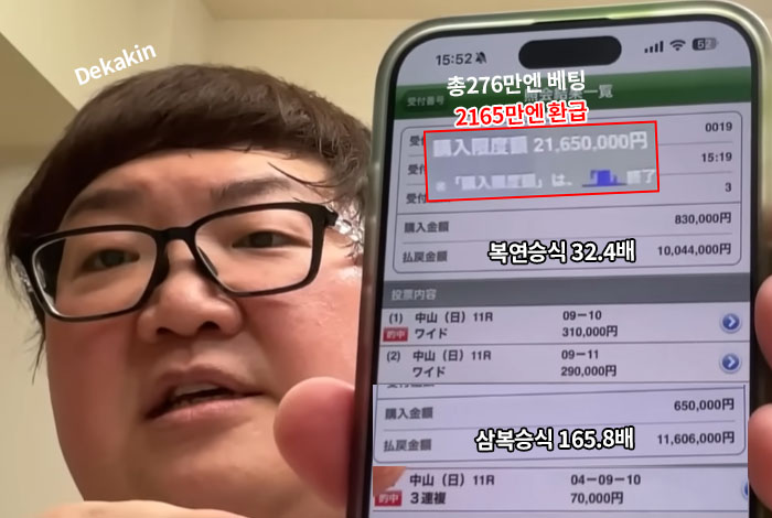 유튜브 구독자 362만명의 데카킨은 복연승식과 삼복승식에 총276만엔을 베팅하여 2165만엔을 환급받았다.
