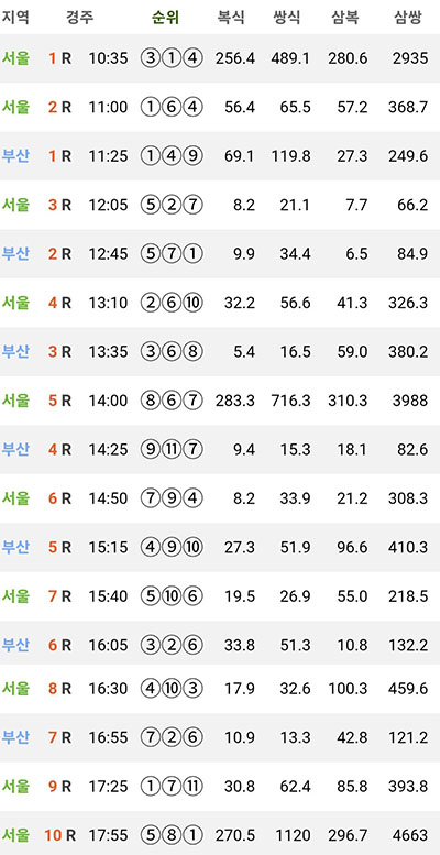 11개 경주에서 강운수(4,2,9) 및 조합패턴이 출현했다. 서울 5경주 터질 것 같아서 배당을 노렸는데 8-7-6으로 들어 왔으면 4195.0배였다. 한방 역전 막경주 부산 7R는 압도적 인기 1위 위너클리어 1착에 강운마번 2번 2착, 강운암시 6번이 3착 입상했다. 문제의 서울 10경주는 인기 꼴찌 5번을 놓고 1,3착 고민을 했는데 3위권으로 돌려 적중에 실패했다. 부산 막경주 동일오행 5의 수가 들어왔고, 서울은 익일 강운수 5번이 1착 아니면 3착 패턴 출현 가능성이 있다고 판단, 5번 대가리 넣어 받치기라도 했어야…