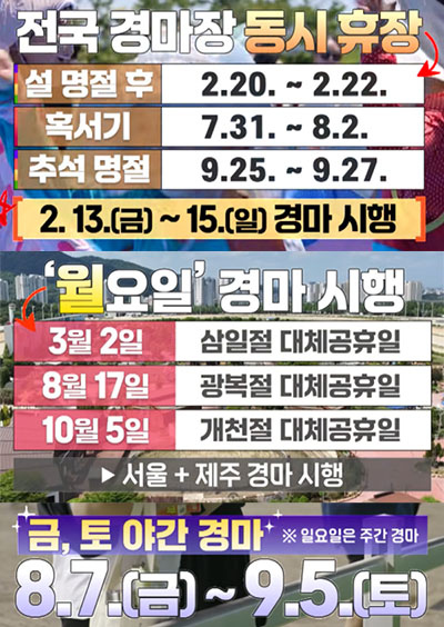 대체 공휴일 월요일 서울, 제주 경마를 시행한다. 3월, 8월, 10월에 4일 연속 개최 3회