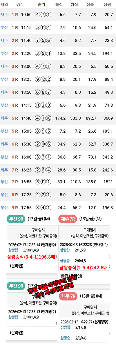 2026년 2월 13일 금요일 한국마사회 부산 경마장에서 9개, 제주 경마장에서 7개 경주를 시행한다. 제주 1경주는 10시 50분, 부경 1경주는 11시 15분에 출발한다. 경마이기는법 검빛 경마왕, 명승부, 경마문화, 코리아레이스 전문가 종합지, 스피드 예상지 5두 마번, 마사회 출마 자료 원스톱 서비스!