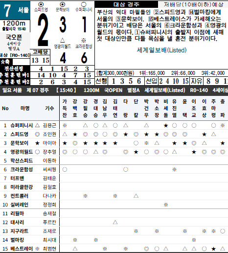 올해 첫 대상경주 서울7경주 제24회 세계일보배(L, 1200m)는 15두가 격돌한다. 부산에서 스피드영, 컨트롤러, 벌마킹 3두가 출전, 지구라트와 한집말인 홍일점 크라운함성은 대회 연패에 도전한다.