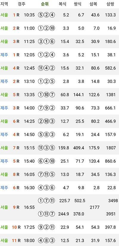 15개 경주 복승식에서 강운수(3,1,7) 및 조합 패턴이 출현했다. 서울 7경주 강운마 원투 삼복승식 175.9배, 삼쌍승식(11-3-5) 1807.3배 적중! 2착 데드히트 동착 최고배당 서울 9경주 강운마 원투쓰리 결착! 서울 10경주 9번 축에 강운수 7,3 조합, 제주와 서울 한방 역전 막경주는 익일 강운수 4번 1착 타이밍