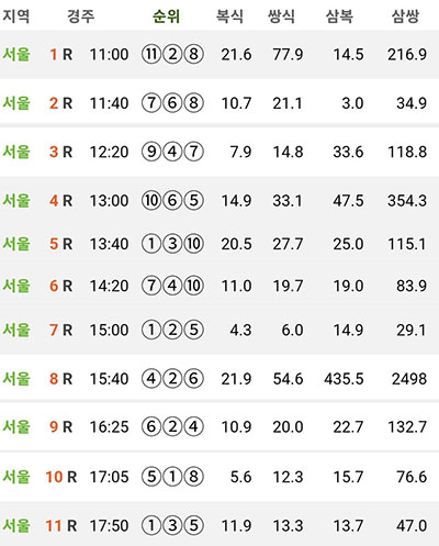 10개 경주에서 강운수(1,2,7) 및 조합 패턴이 출현했다. 8개 경주에서 메인 1의 수가 나왔다.