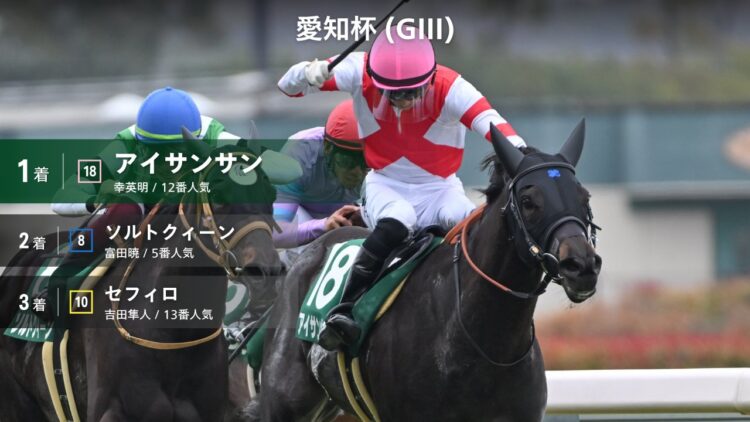 미유키 히데아키(신영명) 기수의 인기 12위(27.6배) 아이산산(Ai Sansan, アイサンサン) 중상 첫 제패