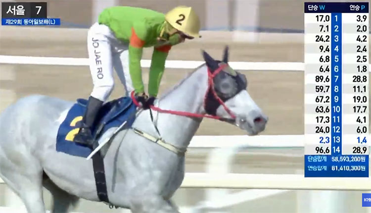 조재로 기수의 인기 4위(7.1배) 라온포레스트(Raon Forest) 작년 KNN배(G3)에 이어 대상경주 2승째
