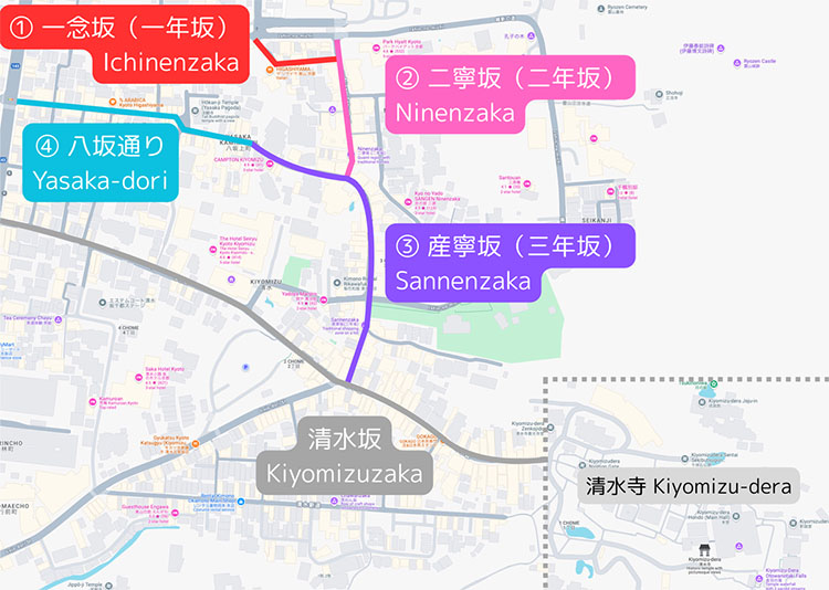 三年坂(산넨자카) 교토시에 있는 거리 이름. 시미즈데라(清水寺)로 이어지는 참배길로서, 다이도3년(大同3年, 808년) 만들어진 것에 유래한다. 안산(安産) 신앙이 있는 코야스칸논(子安観音, 자안관음)의 산케이미치(参詣道)이기 때문에 산네이자카(産寧坂)라고도 한다. 청수사 코야스노토-(子安塔) 당내에 자안관음(=천수관음/千手観音, 센쥬칸논)이 안치되어 있다. 위쪽에 니넨자카(二寧坂, 二年坂)가 있다.