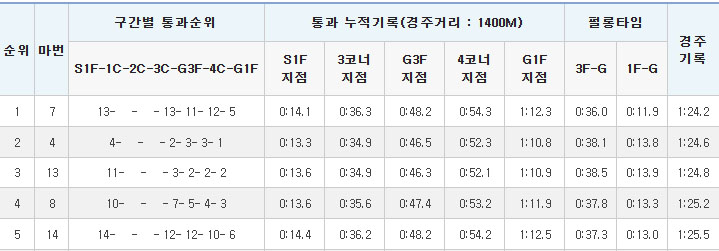 - 출발 시 ②“장비대운”은 안으로 기대며 나와 출발이 늦었고, ⑦“보령라이트퀸”은 출발이 늦었으며, ⑫“서부특송”과 ⑬“글라디우스”는 서로 부딪쳤음. ⑭“라온포레스트”는 ⑮“크라운함성”과 부딪친 후 후미에서 경주를 전개하였음.