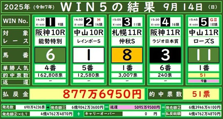 JRA 지정 5개 경주 우승마 적중 로또 승식 WIN5 결과