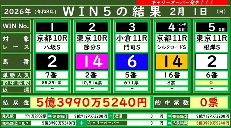 첫 대상 경주인 윈원 교토10R 야사카S 인기 7위 복병마 우승으로 전체 770만여표중 85,391표로 급감했다. 윈투 도쿄10R 세츠분S 종료 후 10,514표, 윈쓰리 고쿠라11R 모지S 종료 후 671표, 윈포 교토11R 인기 16위마 우승으로 대부분 탈락하고 8장 남았다. 마지막 윈파이브 도쿄11R 네기시S(根岸S) 인기 6위마가 우승하며 적중마권 0표